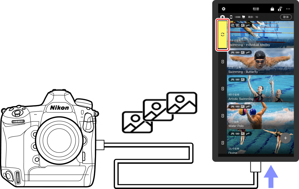 照相机与智能设备连接时,相册列表最上面的相册左侧会出现一个