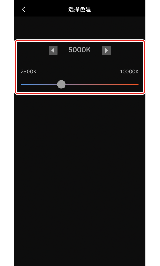 若将白平衡选为[选择色温]并轻触设定值,将出现[选择色温]显示。使用向左和向右按钮或滑块调整色温。
