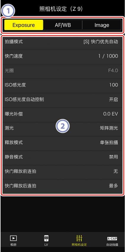 - [Exposure]:配置与曝光相关的设定,如快门速度和光圈。