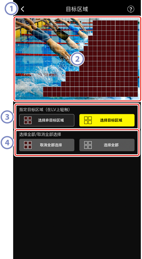 若非目标区域较大,请轻触[取消全部选择],若目标区域较大,请轻触[选择全部],然后使用[指定目标区域(在LV上轻触)]快速配置目标区域。