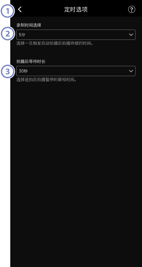 - 显示照相机持续拍摄的时间长度和拍摄间隔。轻触可显示录制时间设定(0配置录制时间)。