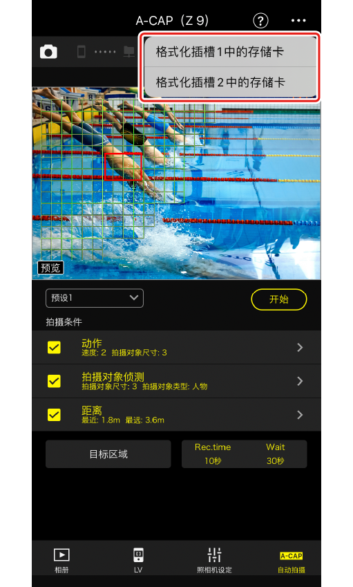 可以从自动拍摄显示菜单格式化插槽1(或主插槽)或插槽2(或第二插槽)的存储卡。