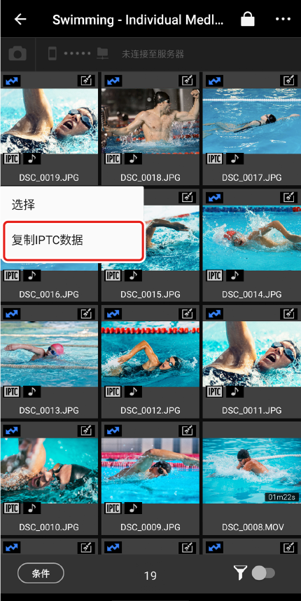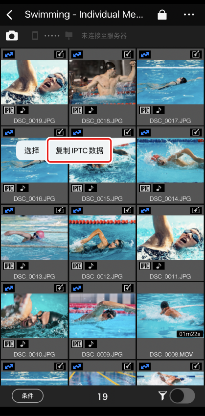 - 在选择模式下同时选择了照片和视频时,会显示FTP和IPTC图标,但视频将被排除在这些操作之外。