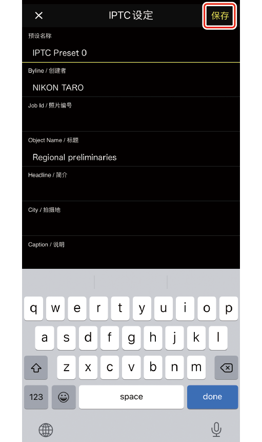 - 若要使用现有IPTC预设,请轻触显示页面左下角的[IPTC预设],选择预设,然后轻触[保存](0创建IPTC预设)。